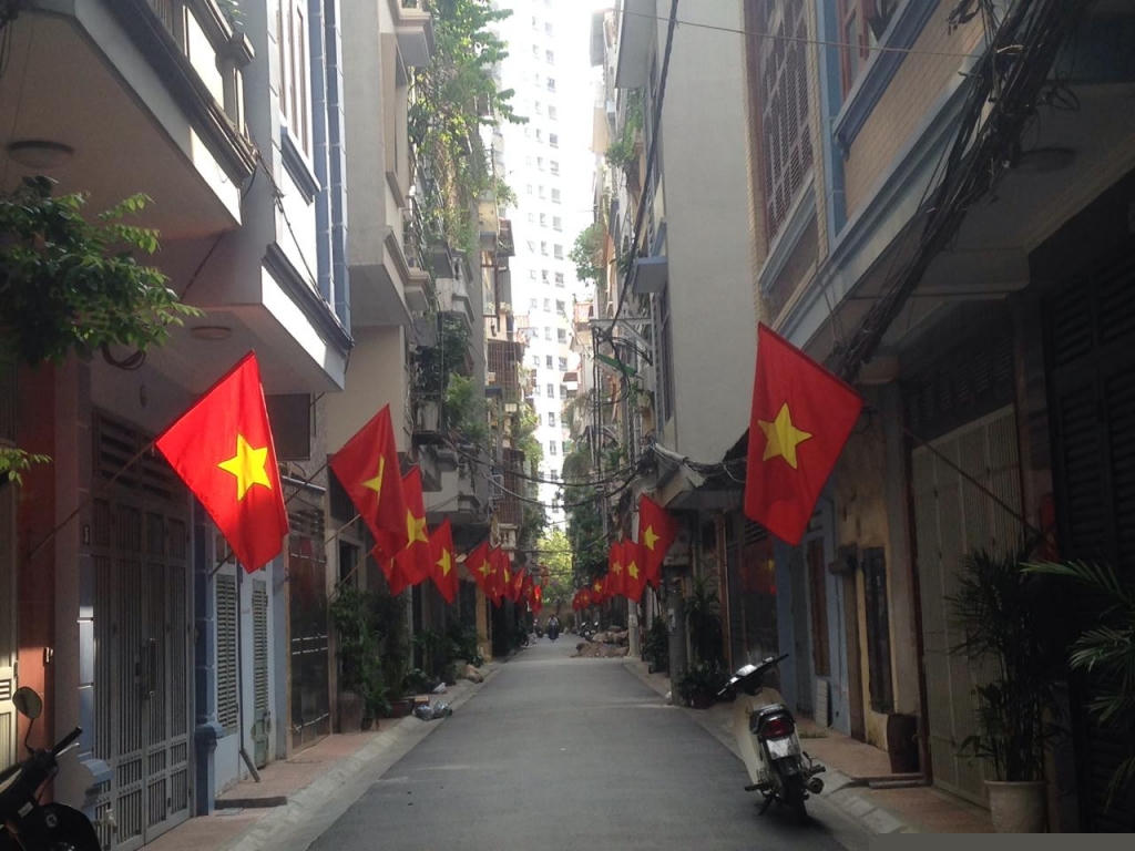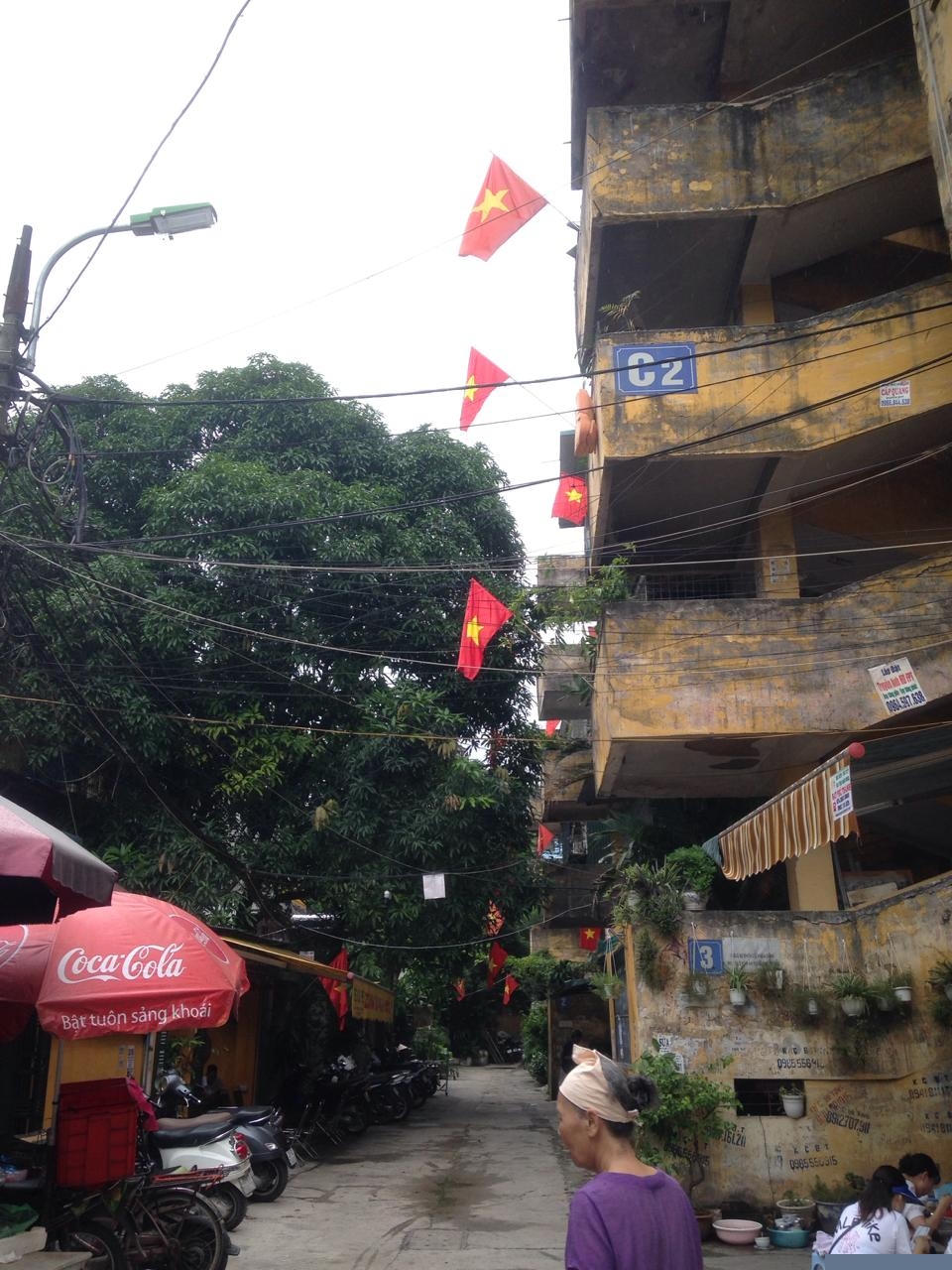 Những khu tập thể cũ của Hà Nội cũng rực rỡ cờ hoa mừng ngày Tết Độc lập của dân tộc.