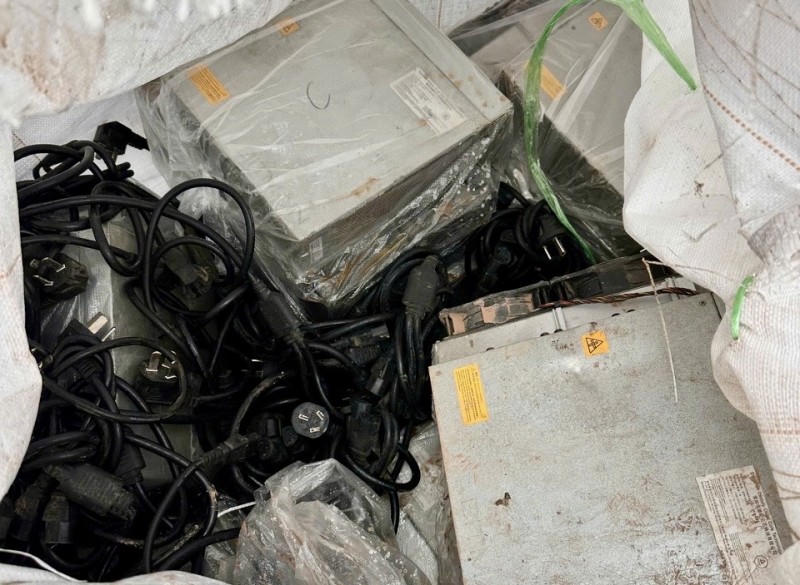 Kiểm tra hiện trường, tổ công tác thu giữ 23 bao tải, bên trong chứa 500 máy đào tiền điện tử đã qua sử dụng, nhãn hiệu Bitman.