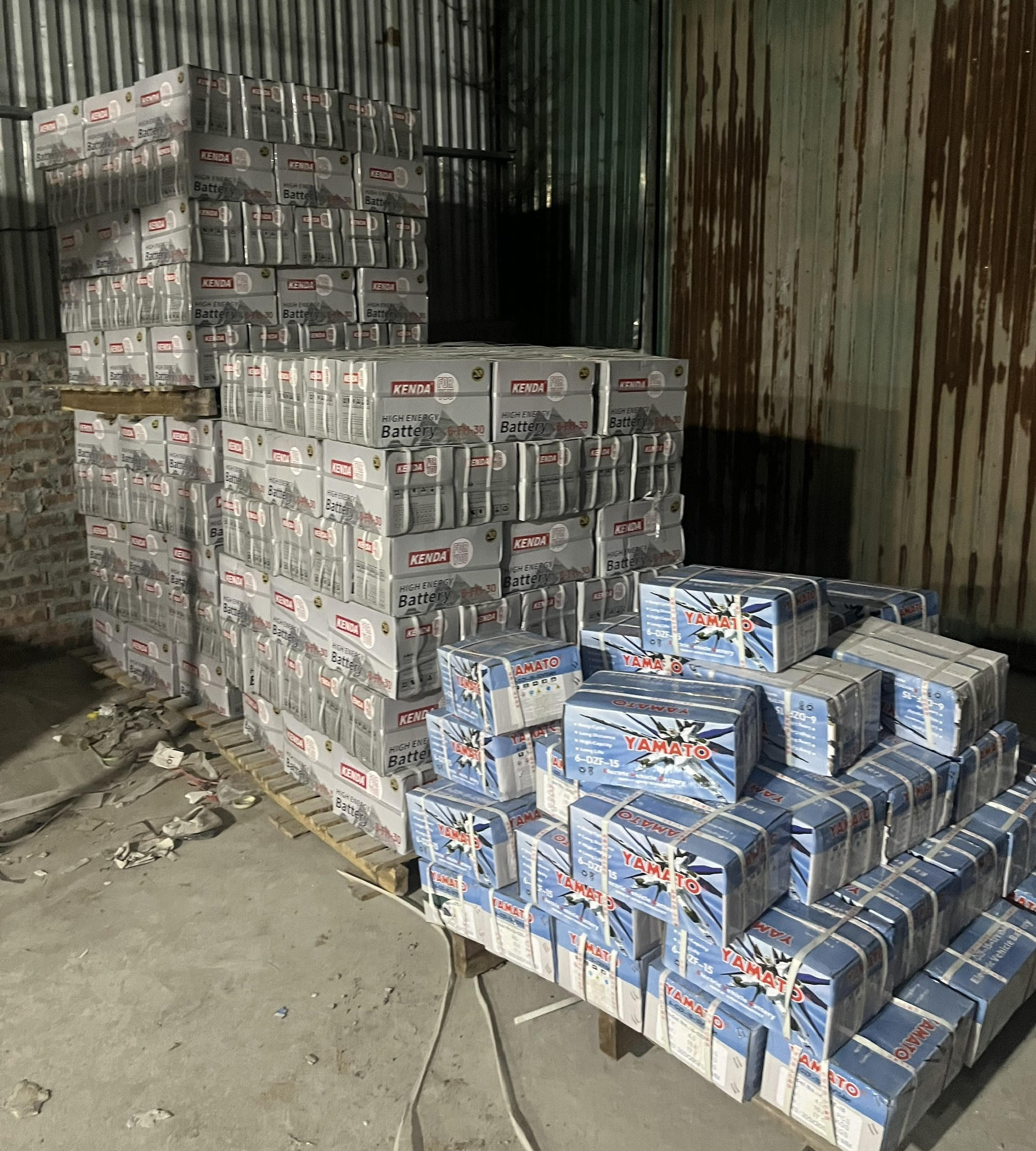 Ngoài ra, lực lượng chức năng còn phát hiện 4.060 bình ắc quy các loại gồm: 600 bình ắc quy nhãn hiệu Yamato, loại 12V (đóng trong 150 thùng cát tông, 4 chiếc/thùng); 1.800 chiếc bình ắc quy nhãn hiệu Kijo, loại 12V 6GFM-15 (đóng trong 450 thùng cát tông, 4 chiếc/thùng); 600 chiếc bình ắc quy CR7 loại 6-FD-30 (đóng trong 150 thùng cát tông, 4 chiếc/thùng); 900 chiếc bình ắc quy nhãn hiệu Kenda loại 48V-30Ah (đóng trong 225 thùng cát tông, 4 chiếc/thùng); 160 chiếc bình ắc quy nhãn hiệu amato loại 6-DPB-15 (đóng trong 40 thùng cát tông, 4 chiếc/thùng).