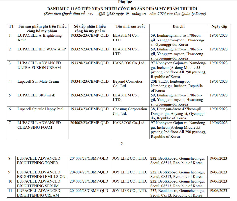 Lupacell Sun Mate Cream (phiếu công bố số 193341/23/CBMP-QLD 19.1.2023); Lupacell S.R.S Mask (phiếu công bố 193342/23/CBMP-QLD 19/01/2023); Lupacell Spicule Happy Peel (phiếu công bố số 193343/23/CBMP-QLD 19/01/2023); Lupacell Advanced cleansing Foam (phiếu công bố số 204002/23/CBMP-QLD 19/06/2023); Lupacell Advanced Brightening Toner (phiếu công bố số 204003/23/CBMP-QLD 19/06/2023); Lupacell Advanced Brightening Emulsion (phiếu công bố 204004/23/CBMP-QLD 19/06/2023); Lupacell Advanced Brightening Serum (phiếu công bố 204005/23/CBMP-QLD 19/06/2023); Lupacell Advanced Brightening Cream (phiếu công bố 204006/23/CBMP-QLD 19/06/2023).