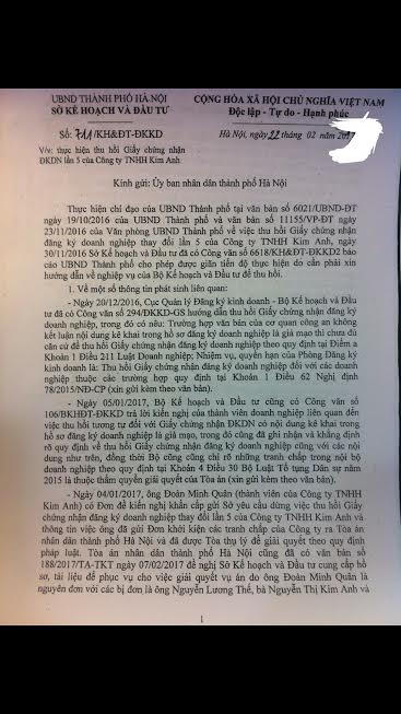 Tiếp đó, ngày 7/2/2017, TAND TP Hà Nội cũng đã có văn bản đề nghị sở KH&ĐT cung cấp hồ sơ, tài liệu để phục vụ cho việc giải quyết vụ án giữa các thành viên trong Công ty TNHH Kim Anh. Những tưởng các cơ sở pháp lý mà bộ KH&ĐT đưa ra sẽ được thực hiện, thì bất ngờ, ngày 22/2, Sở KH&ĐT Hà Nội có văn bản số 711/KH&ĐT-ĐKKD báo cáo UBND TP Hà Nội về việc thực hiện thu hồi Giấy chứng nhận ĐKDN lần thứ 5 của Công ty TNHH Kim Anh, dự kiến thời gian thu hồi là ngày 3/3/2017.