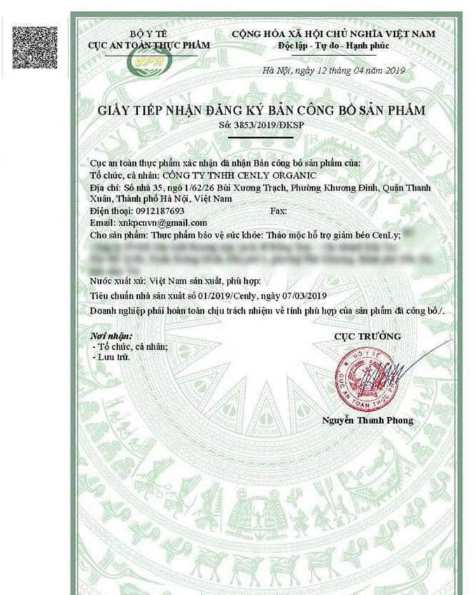 Thu hồi hiệu lực Giấy tiếp nhận đăng ký bản công bố sản phẩm Thực phẩm bảo vệ sức khỏe Thảo mộc hỗ trợ giảm béo Cenly.