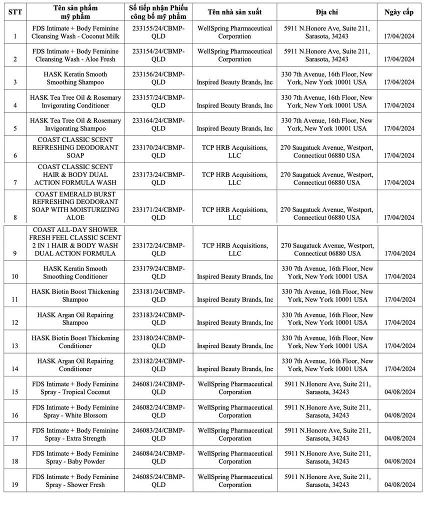 Đồng thời, Cục Quản lý Dược còn thu hồi 19 số tiếp nhận phiếu công bố sản phẩm mỹ phẩm do Công ty cổ phần 361 Việt Nam (địa chỉ NO7B-LK35 Khu đất dịch vụ LK6,LK7,LK10,LK11, phường Vạn Phúc, quận Hà Đông, TP Hà Nội) chịu trách nhiệm đưa ra thị trường. 19 loại mỹ phẩm này là sản phẩm nhập khẩu từ Mỹ, gồm sữa rửa mặt, kem dưỡng da, dầu gội đầu, sữa tắm...