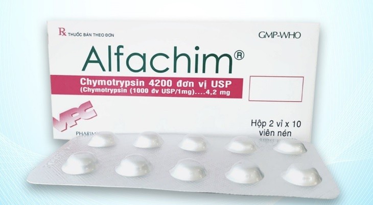 | Viên nén Alfachim 4.2 (Chymotrypsin tương đương 21 microkatal chymotrypsin, 4200 IU) của Công ty cổ phần Dược phẩm Cửu Long sản xuất. |