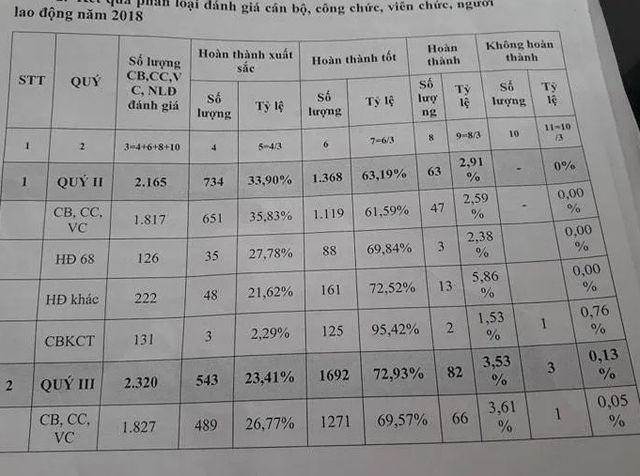Như ở huyện Nhà Bè, trong quý III/2018, tính toàn bộ cán bộ, công chức, viên chức ở địa bàn, trong đó khối sự nghiệp giáo dục chiếm số lượng cao nhất chỉ có 23,4% người hoàn thành xuất sắc nhiệm vụ, quý II là đỡ hơn nhưng cũng chỉ 33,9% người hoàn thành xuất sắc nhiệm vụ, quý IV là trên 49,5%.