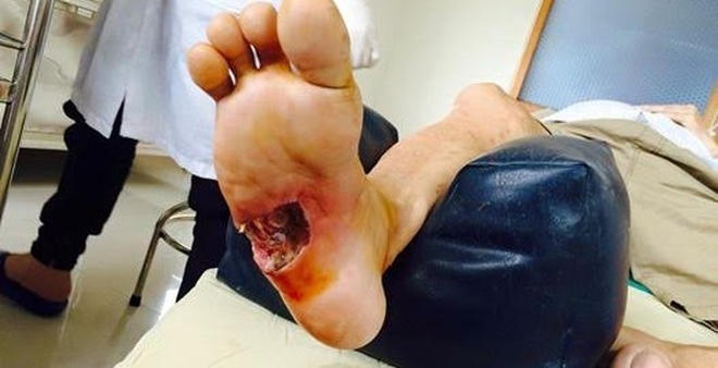Diện tích thịt bàn chân hoại tử ngày càng rộng nhanh chóng. Ông đến thẳng Bệnh viện Nội tiết trung ương điều trị. Kết quả, bác sĩ cho biết ông bị biến chứng bàn chân do bệnh tiểu đường.