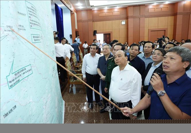 Thủ tướng Nguyễn Xuân Phúc và các đại biểu xem bản đồ chỉ huy cứu hộ, cứu nạn tại huyện Phước Sơn và Nam Trà My, Quảng Nam. Ảnh: Thống Nhất/TTXVN