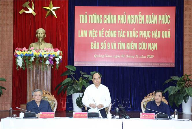 Sau khi trực tiếp thị sát công tác khắc phục hậu quả bão số 9 và thăm hỏi đời sống bà con nhân dân tại Quảng Ngãi, Quảng Nam, chiều 1/11, tại thành phố Tam Kỳ, tỉnh Quảng Nam, Thủ tướng Nguyễn Xuân Phúc đã làm việc với lãnh đạo các địa phương: Quảng Nam, Quảng Ngãi, Bình Định, thành phố Đà Nẵng về khắc phục hậu quả cơn bão và công tác tìm kiếm, cứu nạn.