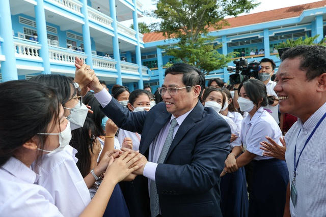 Tại đây, Thủ tướng Phạm Minh Chính ân cần thăm hỏi điều kiện sinh hoạt, việc học tập của các em học sinh, đi kiểm tra trường lớp, khu bán trú, khu sinh hoạt chung, khu nhà ăn của nhà trường và nắm bắt tình hình thực tế về chính sách giáo dục với con em đồng bào dân tộc thiểu số cũng như những tồn tại, vướng mắc đối với hệ thống các trường dân tộc nội trú.