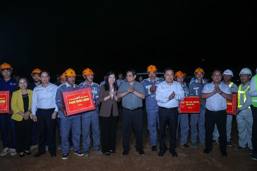 Tối cùng ngày, Thủ tướng tiếp tục kiểm tra thực địa, động viên, tặng quà cán bộ, công nhân viên thi công ca đêm dự án cao tốc Hữu Nghị - Chi Lăng (tại xã Bắc Thủy, huyện Chi Lăng, tỉnh Lạng Sơn).