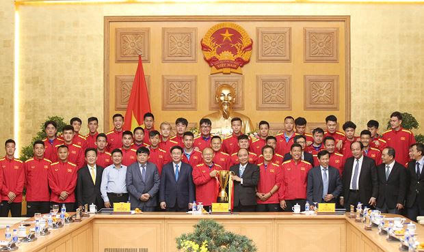 Thủ tướng nhấn mạnh thành tích của Đội tuyển giành được sau 10 năm chờ đợi là sự đóng góp lớn vào đời sống tinh thần của gần 100 triệu người dân Việt Nam, tạo không khí hồ hởi trong toàn dân vào dịp cuối năm, đóng góp một gam màu rất sáng đối với niềm tin của nhân dân trong phát triển thể thao của đất nước, trong đó có môn bóng đá. "... Thay mặt Chính phủ, tôi biểu dương, đánh giá cao HLV Park Hang Seo, ban huấn luyện và đặc biệt là các cầu thủ. Chiến thắng là quan trọng, niềm tin của người dân càng lớn lao hơn", Người đứng đầu Chính phủ nói.