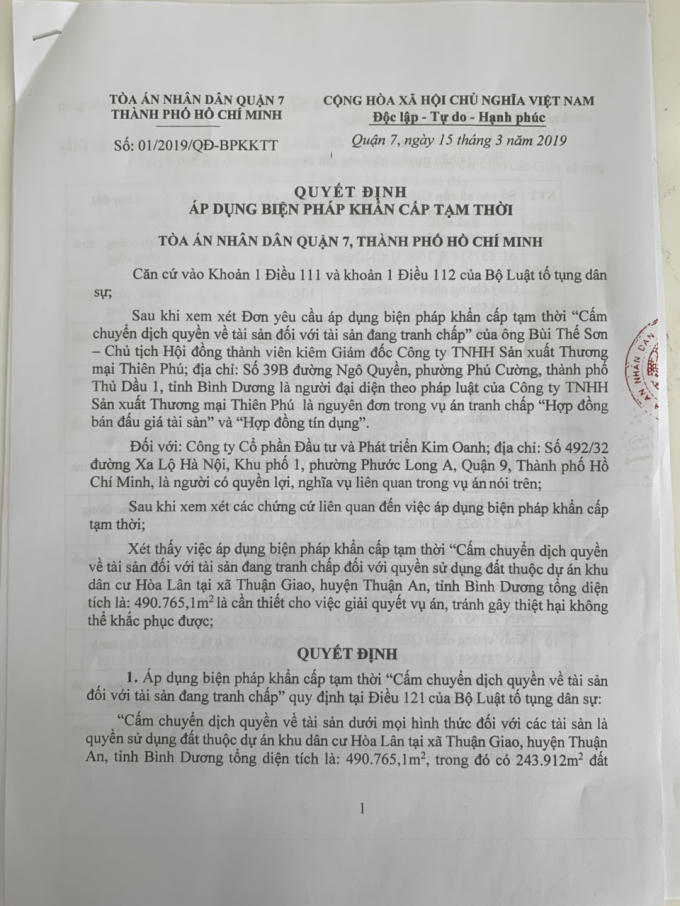 Mới đây, ngày 15/3, TAND quận 7 đã ra Quyết định Áp dụng biện pháp khẩn cấp tạm thời cấm chuyển dịch quyền về tài sản dưới mọi hình thức đối với dự án KDC Hòa Lân.