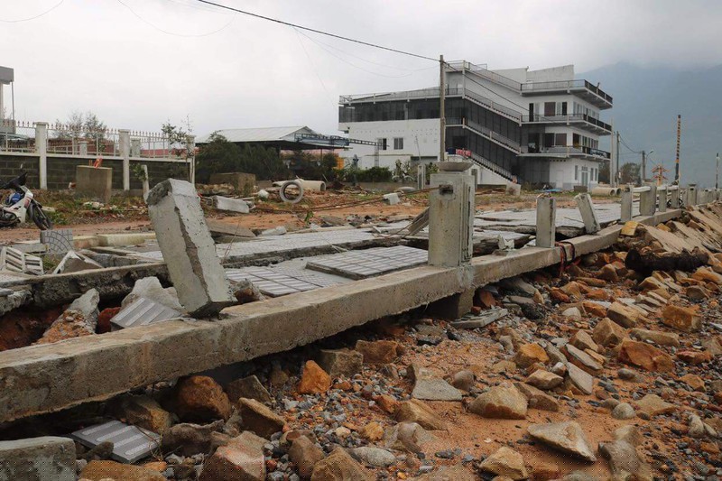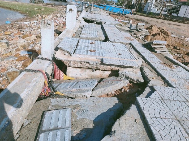 Ghi nhận tại hiện trường, nhiều đoạn bờ kè bị sóng đánh làm sụt lún, hàng loạt mảng bê tông bị sóng đánh dạt mạnh, cuốn lên trên mặt đường, hệ thống lan can bị sóng gió quật đổ ngổn ngang, trơ cả sắt thép bên trong…