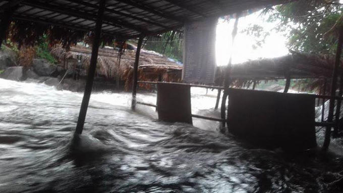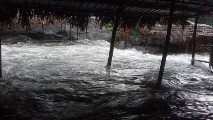 Tại Suối Voi sau cơn mưa giông nước suối bỗng dưng dâng lên cao, chảy xiết, tràn vào hầu hết các liều quán khiến nhiều khách du lịch khiếp vía.