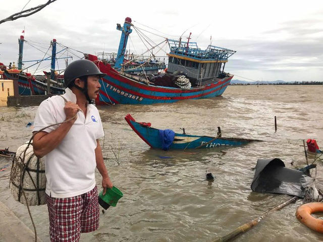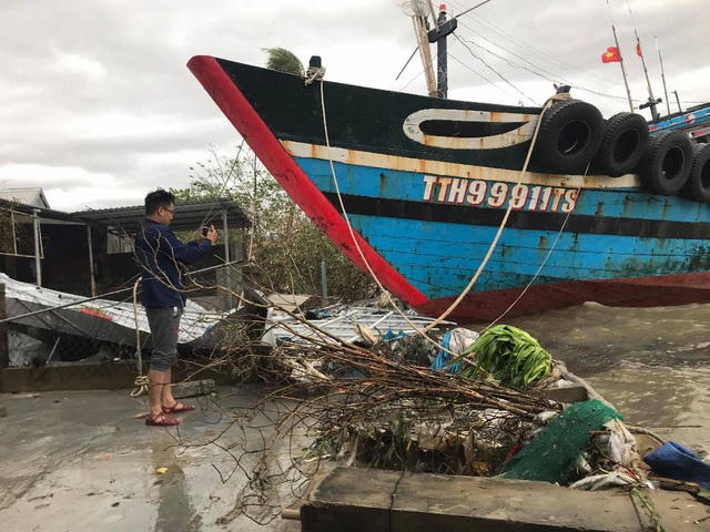 Trong gần 5 giờ quần thảo tại Thừa Thiên Huế từ khuya đến rạng sáng 15/11, bão số 13 làm tàu cá của người dân neo đậu ở thôn Hải Tiến, thị trấn Thuận An, huyện Phú Vang bị va đập và vỡ chìm