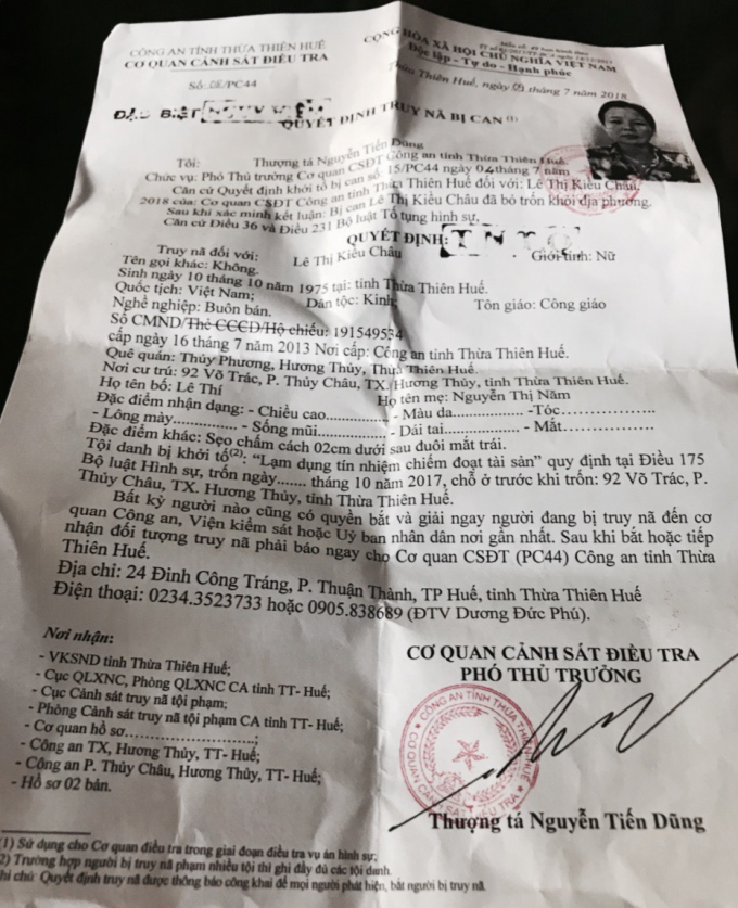 Tiếp đó, Phòng CSĐT Công an tỉnh Thừa Thiên Huế, đã ra Quyết định truy nã số 08/PC44 ngày 9/7/2018 đối với bị can Lê Thị Kiều Châu (43 tuổi, trú tại 92 Võ Trác, P. Thủy Châu, TX. Hương Thủy, tỉnh Thừa Thiên Huế) về hành vi như tội danh đã khởi tố.