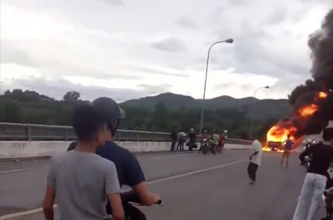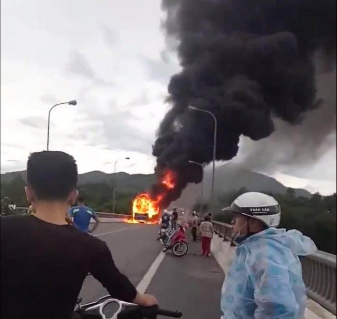 Chỉ một thời gian ngắn sau khi những người trên xe chạy thoát, ngọn lửa bùng lên bao trùm toàn bộ thân xe. Vụ cháy làm phát ra những tiếng nổ lớn, cột khói bốc lên cao. Giao thông tuyến Quốc lộ 1A tránh TP Huế bị tắc nghẽn nghiêm trọng trên nhiều km bởi vụ cháy này.