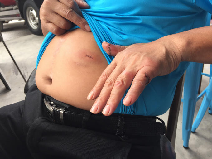 Hậu quả khiến ông Giang bị thương ở bụng và nhiều vết thương sâu ở tay trái.