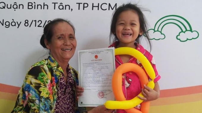 Bà cháu bé Thúy Vy vui mừng với giấy khai sinh của bé.
