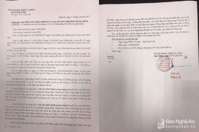Đang mòn mỏi chờ đợi, ngày 17/10, các hộ dân bỗng nhận được 1 văn bản thông báo từ phía Ngân hàng Thương mại cổ phần Á Châu (ACB), Phòng giao dịch Chợ Vinh với nội dung các căn hộ của họ bị chủ đầu tư thế chấp và ngân hàng sẽ tiến hành xử lý toàn bộ tài sản đã thế chấp để thu hồi khoản nợ vay. Thông tin này lại khiến người dân hoang mang, lo lắng căn nhà mà họ dành dụm, tích góp tiền của để mua sẽ bị ngân hàng siết nợ, mà lại là gánh nợ cho người khác?.