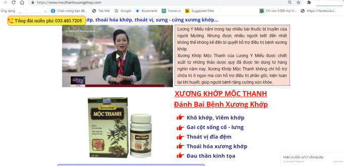 Theo thông tin từ Cục An toàn thực phẩm - Bộ Y tế, thời gian qua trên một số website: http://www.suckhoe24h-vn.online , https://sieuthisongkhoe.com , https://www.mocthanhxuongkhop.com/ , https://www.healcentral.org đang quảng cáo sản phẩm thực phẩm bảo vệ sức khỏe Xương Khớp Mộc Thanh vi phạm: Quảng cáo gây hiểu nhầm có tác dụng như thuốc chữa bệnh; Quảng cáo sử dụng hình ảnh, uy tín của nhân viên y tế để quảng cáo thực phẩm.
