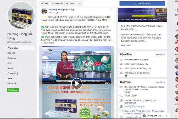 Trên trang quảng cáo của sản phẩm Phương đông Đại tràng cũng cắt ghép nội dung bản tin Y tế 24h của VTV.