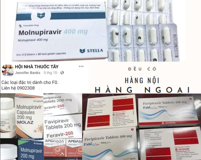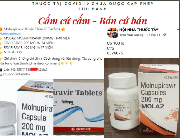 Trên các hội, nhóm nhà thuốc và trình dược đăng tải nhiều bài viết rao bán thuốc chữa Covid-19 chứa các hoạt chất hiện chưa được cấp phép lưu hành tại Việt Nam có đủ các tên thuốc khác nhau được chào bán như: Molnupiravir 400mg; Movfor 200mg; Molaz 200mg; Fabi flu 400mg; Favivir 20mg; Feravir 400mg… hàng của các nước Nga , Ấn Độ, Việt Nam,… sản xuất.