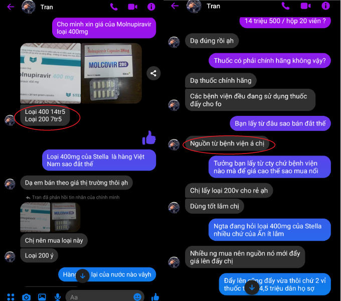 PV tỏ ra băn khoăn về giá thuốc cao, được người bán cho biết: “Nhiều người mua nên nguồn mới đẩy giá lên. Molcovir 200mg/hộp 40 viên giá 7,5 triệu; Molaz 200mg/ hộp 40 viên có giá 5 triệu đồng…”.