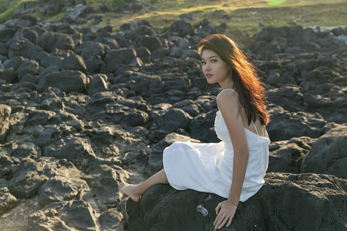 Cách thành phố Phan Thiết 120 km với 4 tiếng đi tàu cao tốc, đảo Phú Quý mang một vẻ đẹp vừa hùng vĩ vừa nên thơ. Xuất hiện giản dị trong bộ váy màu trắng, Thùy Dung có cơ hội khám phá, thăm quan, trải nghiệm cuộc sống trên đảo tiền tiêu của đất nước. Đó là đỉnh Cao Cát lộng gió, là phong điện Phú Quý hay bãi biển tràn ngập ánh hoàng hôn ở vịnh Triều Dương... Từ trên đỉnh cao nhất của hòn đảo, Thùy Dung đắm mình vào thiên nhiên, ôm lấy khung cảnh tuyệt đẹp và bao la như say đắm lòng người.