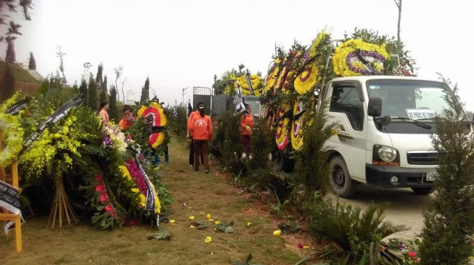 14h: Sau khi linh cữu của nhạc sĩ hạ Kim Tĩnh thành công, đơn vị phụ trách công tác an táng tiến hành rải hoa hồng và phủ thổ tạo mộ.