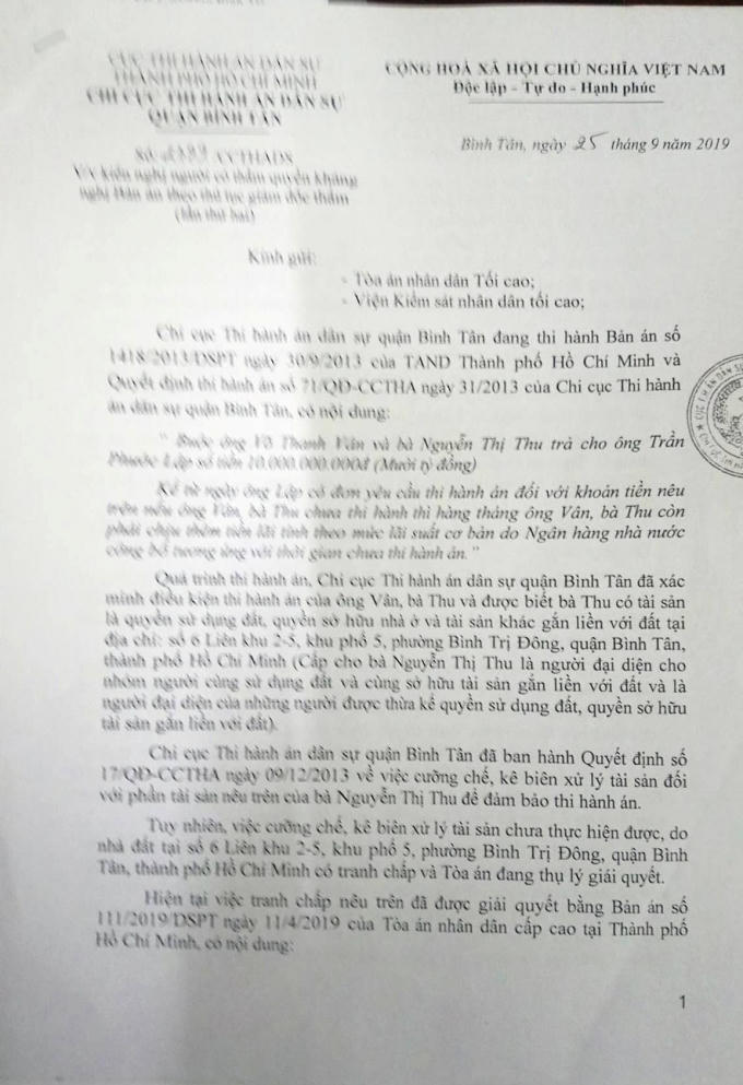 Văn bản số 2399/CCTHADS của Chi cục Thi hành án dân sự (THADS) quận Bình Tân gửi TAND Tối cao và VKSND Tối cao cho biết, theo Bản án án số 1418/2013/DSPT ngày 30/9/2013 của TAND TP HCM và Quyết định thi hành án số 71/QĐ-CCTHA ngày 31/10/2013 của Chi cục THADS quận Bình Tân “buộc ông Vân và bà Thu trả cho ông Lập số tiền 10 tỷ.