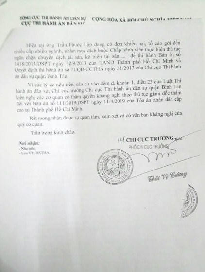 “Với các lý do nêu trên, căn cứ vào điểm đ khoản 1 Điều 23 Luật THADS, Chi cục trưởng Chi cục THADS quận kiến nghị các cơ quan có thẩm quyền kháng nghị theo thủ tục giám đốc thẩm với Bản án số 111/2019/DSPT”, ông Cường nói.