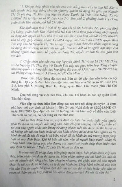 Ông Thái Vệ Cường, Phó Chi cục trưởng Chi cục THADS quận cho biết: “Việc cưỡng chế, kê biên xử lý tài sản chưa thực hiện được, do nhà đất tại số 6, liên khu 2-5 có tranh chấp và tòa đang thụ lý giải quyết ở một vụ án khác. Hiện việc tranh chấp đã được giải quyết bằng Bản án số 111/2019 DSPT ngày 11/4/2019 của TAND Cấp cao tại TP HCM, trong đó nội dung phán quyết cho biết: “Chấp nhận yêu cầu của ông Nguyễn Minh Trí, bà Lê Thị Mỹ Hồng và bà Nguyễn Thị Thu, ông Võ Thanh Vân tiếp tục thực hiện Hợp đồng chuyển nhượng quyền sử dụng đất theo Hợp đồng đặt cọc số 33301 ngày 4/10/2013 ký tại Phòng Công chứng số 3 TP HCM”.