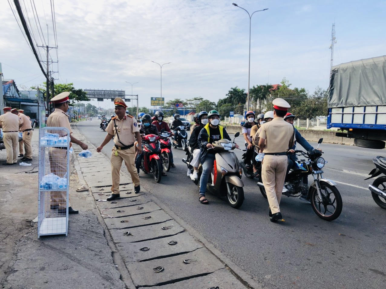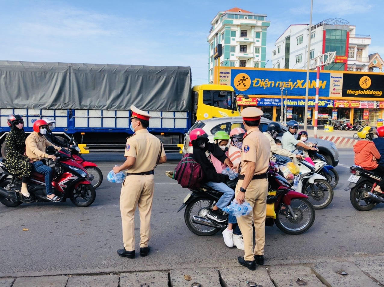 Để động viên tinh thần và tiếp sức cho người dân trở lại thành phố làm việc sau Tết, Phòng Cảnh sát giao thông Công an tỉnh Đồng Nai đã tổ chức phát nước uống, khăn lạnh miễn phí cho người dân đi xe máy qua địa bàn tỉnh.