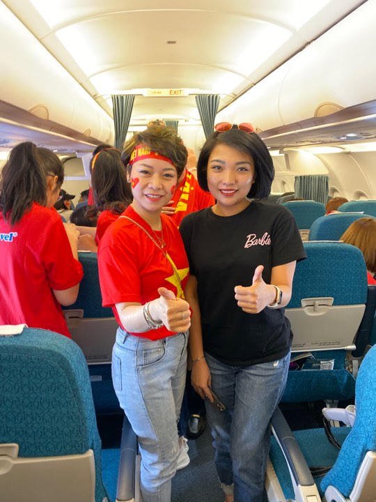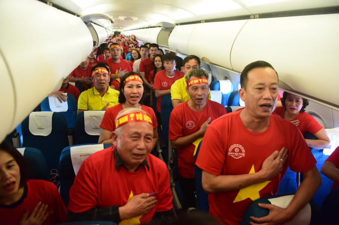 Bài hát "Tiến quân ca" trang trọng và bài hát truyền thống “Như có bác Hồ trong ngày vui đại thắng" đã được vang lên đầy xúc động. Thật bất ngờ khi đoàn nữ tiếp viên của Vietnam airlines cũng đã tham gia hát cùng toàn thể cổ động viên trên chuyến bay.