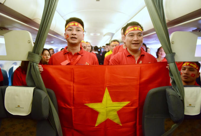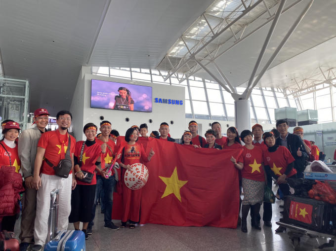 Được biết, sáng nay đã có hàng trăm cổ động viên với cờ đỏ sao vàng có mặt tại sân bay quốc tế Nội Bài làm thủ tục sang Philippines. Ngoài đưa khách đi chung với các đoàn khác, công ty du lịch Vietravel đã thuê 1 chiếc máy bay charter của Vietnam Airlines đưa khách sang Manila cổ động trận chung kết bóng đá nam SEA Games 30.