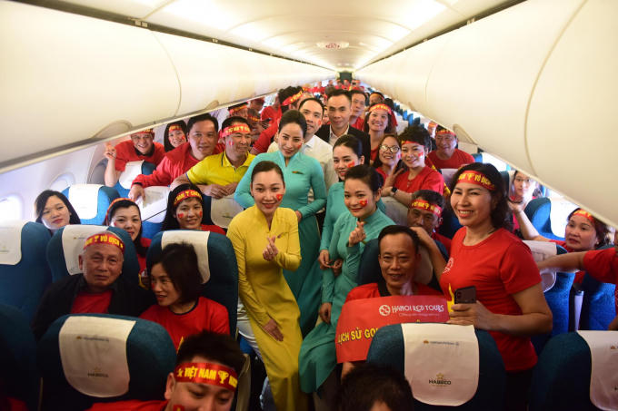 Đoàn tiếp viên Vietnam Airlines chụp ảnh cùng cổ động viên trên chuyến bay