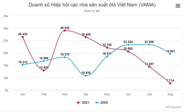 Tình trạng giãn cách để phòng chống Covid-19 tại nhiều tỉnh, thành, đặc biệt Hà Nội, TP HCM, khiến doanh số thị trường ôtô giảm sâu trong tháng 8 và là tháng thứ 5 liên tiếp giảm. Hiệp hội các nhà sản xuất ôtô Việt Nam (VAMA) chỉ bán 7.714 xe, thấp nhất từ đầu năm và thấp nhất kể từ 2015, một năm sau khi tổ chức này công bố số liệu thường niên trên website (2014).