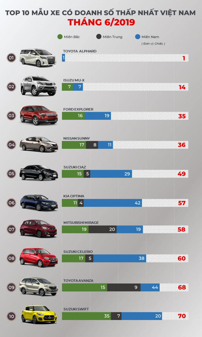 Top 10 mẫu xe “ế ẩm” nhất thị trường Việt Nam trong tháng 6/2019