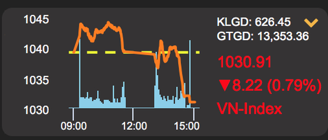 Chỉ số quay đầu giảm sâu 8,22 điểm tương ứng 0,79% còn 1030,91 điểm. Đồ thị VN-Index gần như lao thẳng đứng kể từ thời điểm 14 giờ.