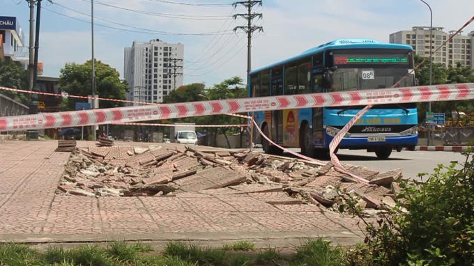 Qua ghi nhận thực tế của PV Pháp luật Plus vào ngày 14/5, những hố sụt, lún xuất hiện ngay trên mặt cầu Tứ Hiệp xuất hiện trên phần vỉa hè dành cho người đi bộ.