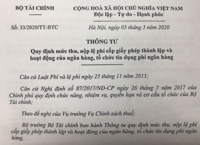 Theo Bộ Tài chính, ngày 05/5/2020, Bộ trưởng Bộ Tài chính đã ký ban hành Thông tư số 33/2020/TT-BTC Quy định mức thu, nộp lệ phí cấp giấy phép thành lập và hoạt động của ngân hàng, tổ chức tín dụng phi ngân hàng.