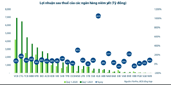 Trong báo cáo đánh giá về nhóm ngân hàng, chứng khoán BOS thống kê, tổng thu nhập hoạt động của các ngân hàng Việt Nam tăng trưởng mạnh trong quý 1/2021. Tổng thu nhập hoạt động của các ngân hàng niêm yết tại Việt Nam đạt 109.765 tỷ đồng, đạt mức tăng trưởng chung là 28,4% so với cùng kỳ năm trước.