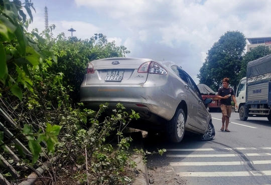Chiếc ô tô 4 chỗ bị biến dạng phần đầu, bánh trước bị bể và nằm vắt trên dải phân cách. Hai người bên trong xe hoảng loạn kêu cứu, trong đó người ngồi phía sau bị thương phải nhập viện cấp cứu.