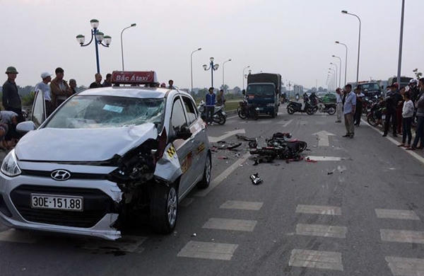 2 thanh niên đi trên chiếc xe máy Honda Winner chạy với tốc độ cao đã đâm sầm vào một chiếc taxi chạy chiều ngược lại khiến cả 2 bị thương nặng, xe máy nát bươm.