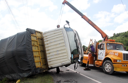 | Xe cứu hộ cẩu ôtô tải gặp nạn ra khỏi hiện trường. Ảnh: Xuân Ngọc |