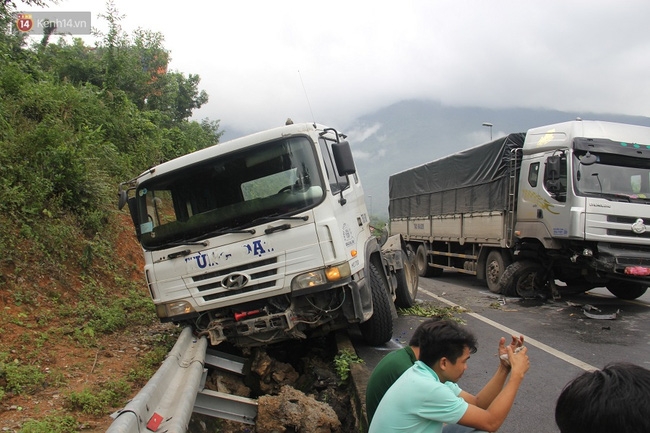 Cú húc mạnh khiến xe đầu kéo trượt một đoạn, đâm gãy taluy rồi nghiêng xuống đường thoát nước. Tại hiện trường, cả 2 xe đều bị hư hỏng nặng.