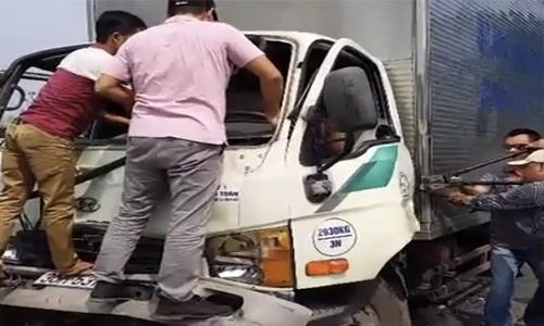 Ôtô tải tông xe khách, tài xế đau đớn kẹt trong cabin