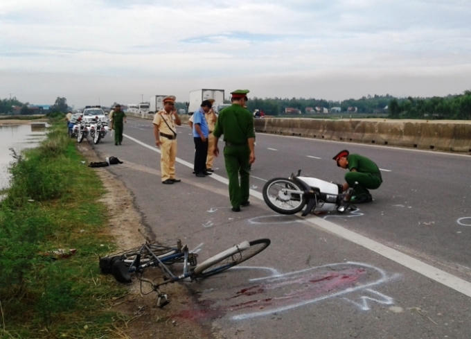 Tại hiện trường, chiếc xe đạp ngã chỏng chơ bên lề đường, cạnh vũng máu của nạn nhân. Chiếc xe máy bị hư hỏng nhẹ.