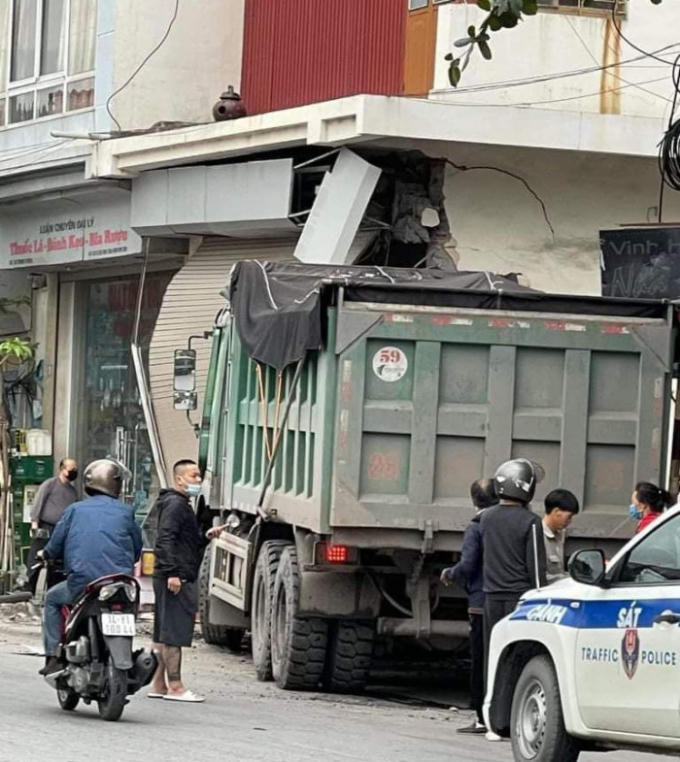 Sau đó, xe tải BKS 28C-073.45 tiếp tục đâm vào nhà anh Đặng Anh T. (SN 1971, trú tại phường Trưng Vương, Uông Bí, Quảng Ninh) khiến cửa cuốn ngôi nhà bung ra, một phần tường nhà bị đâm sập.